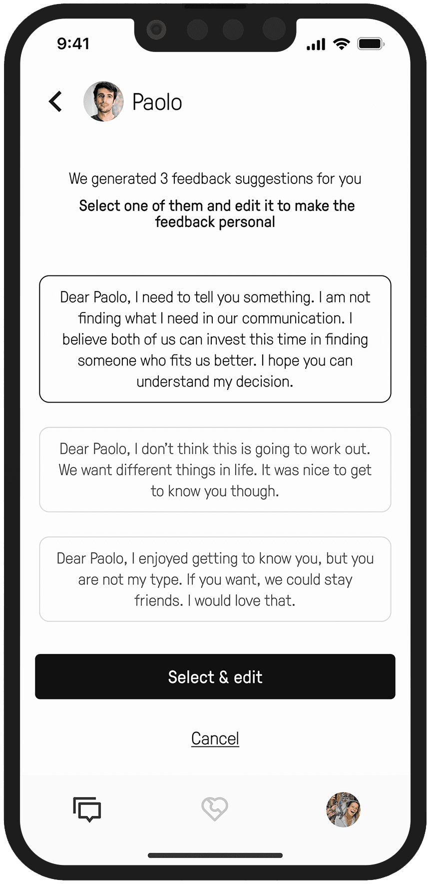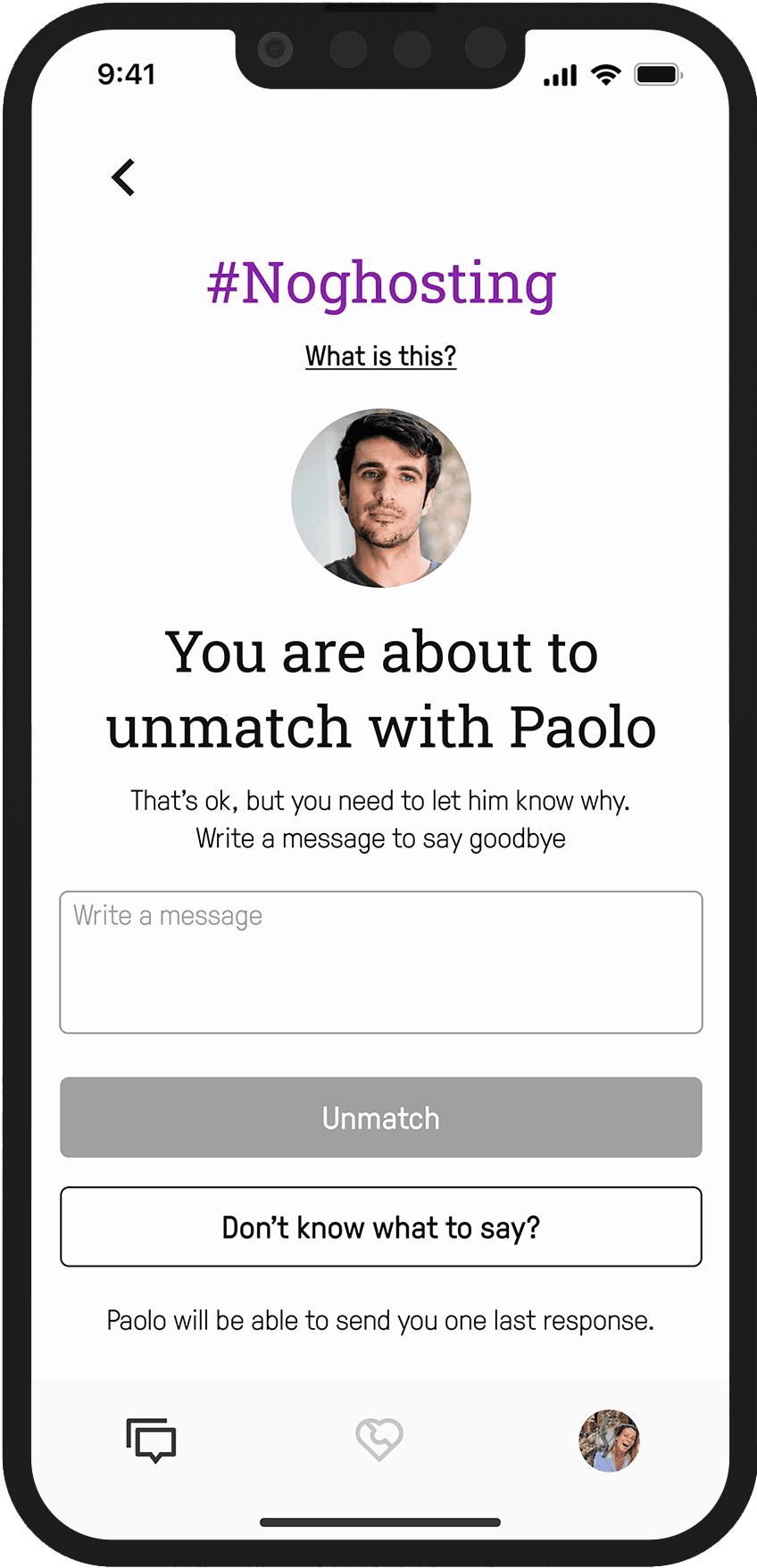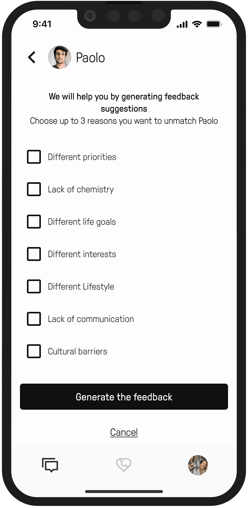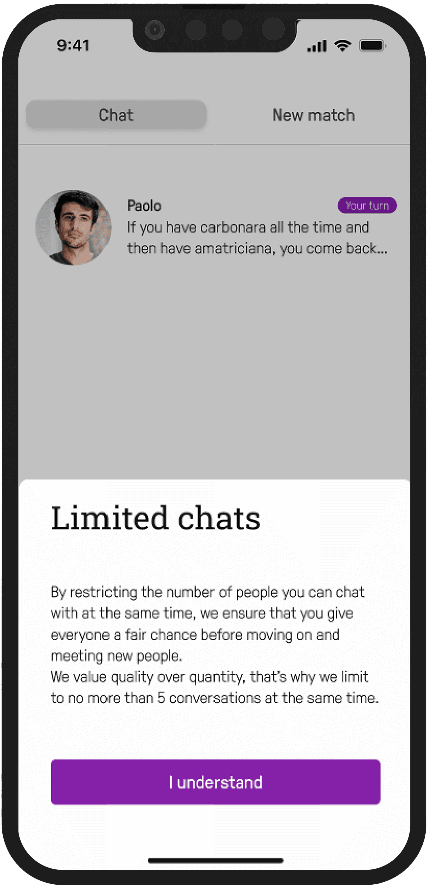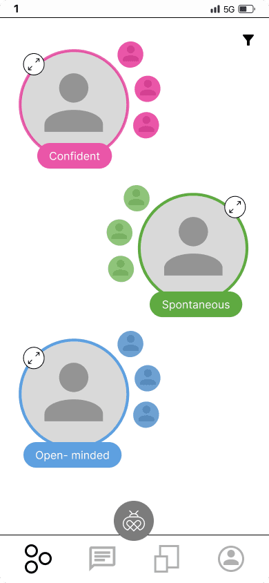 Users can only interact with 5 people at a time, ensuring that Choice overload is reduced and users can focus on getting to know each of the matches they have.